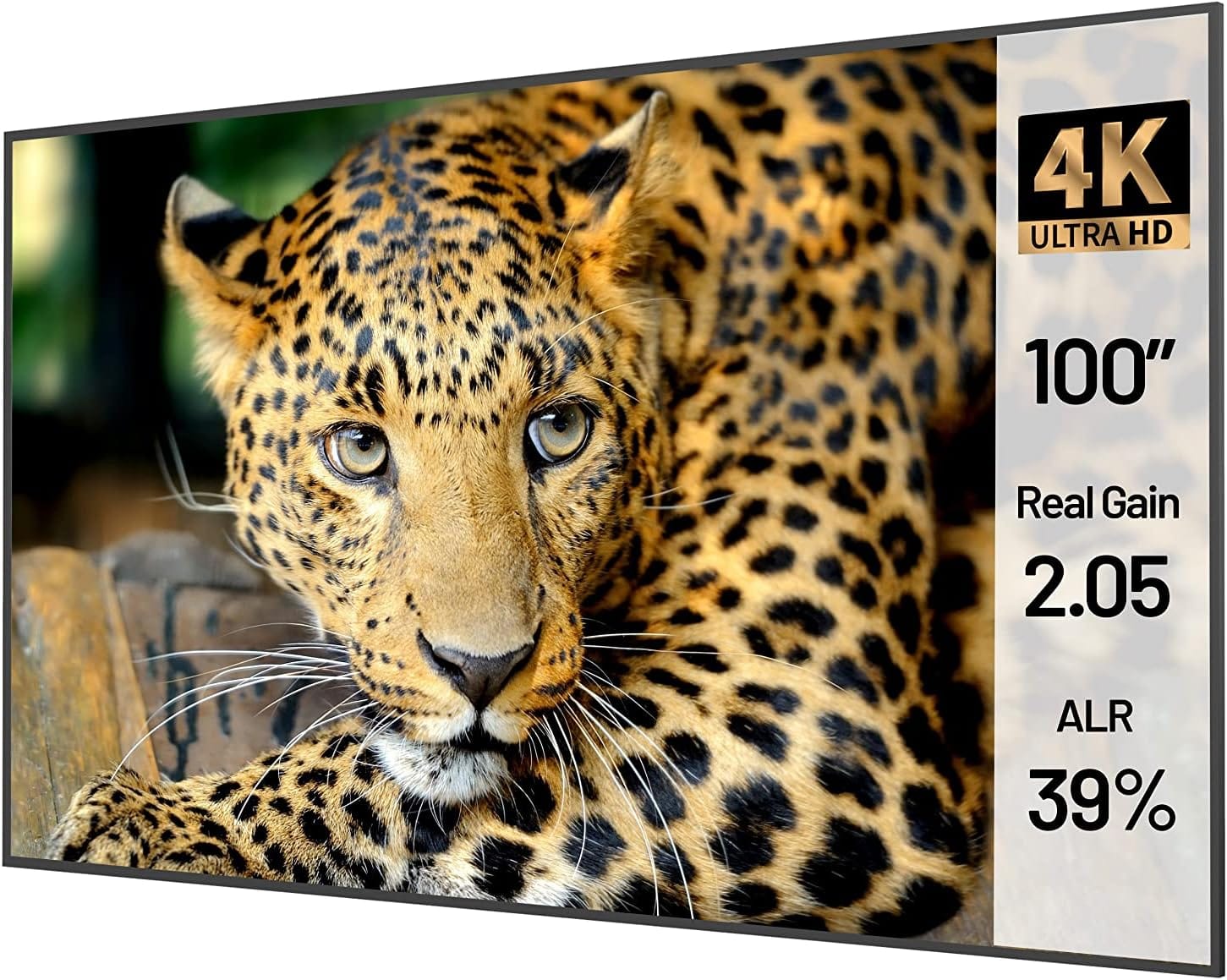 The Scanner ALR(CLR- Ceiling Light Rejecting technology) Projector Screen is a top choice for ultra short throw projectors, with its impressive 90% rejection ratio and 0.6 gain. Its lightweight aluminum alloy frame and edge-free design make it a sleek and modern addition to any home theater setup.