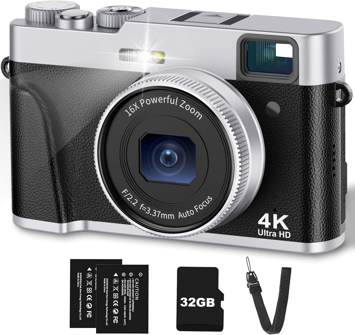 Get this for clear shots in both bright and low-light conditions, time-lapse captures, and as a budget-friendly option for beginners or casual photographers. Its Amazon rating is 4.1/5 stars. The package includes a 32GB memory card, two rechargeable batteries, a lanyard, a charging adapter and cable, a user manual, and a year warranty.